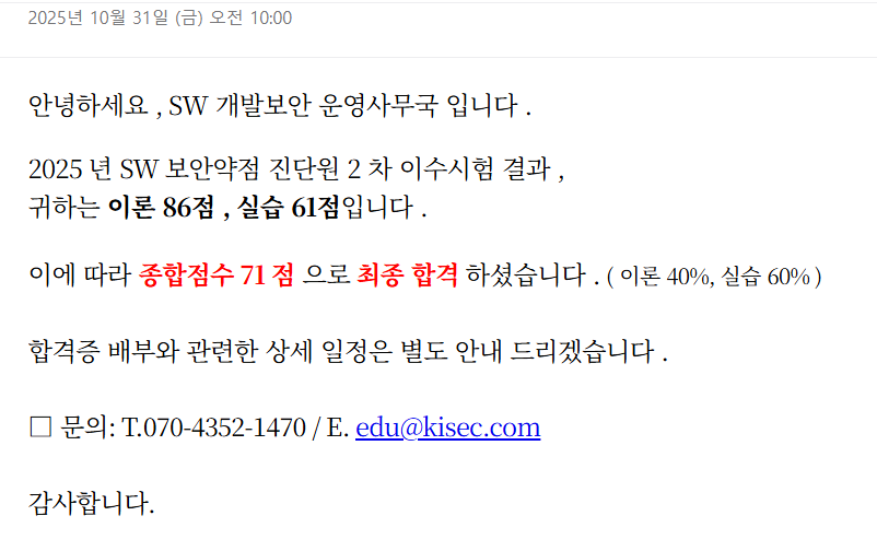 나에게 애증의 자격증이 되어버린 SW보안약점 진단원... 2023년에 1차 교육에 참석한 후, 2023년 1차 자격시험에 응시하여 동회차 합격!!!!! 했다고 자랑하면 좋겠지만 사실은... 4수만에 합격했다. 일
