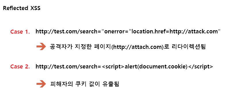 공격자는 보통 스크립트가 포함된 링크를 클릭하게 하여 공격자가 원하는 사이트(피싱사이트 등)에 접근하게 하거나 세션 값을 유출 시키는 행위를 한다.